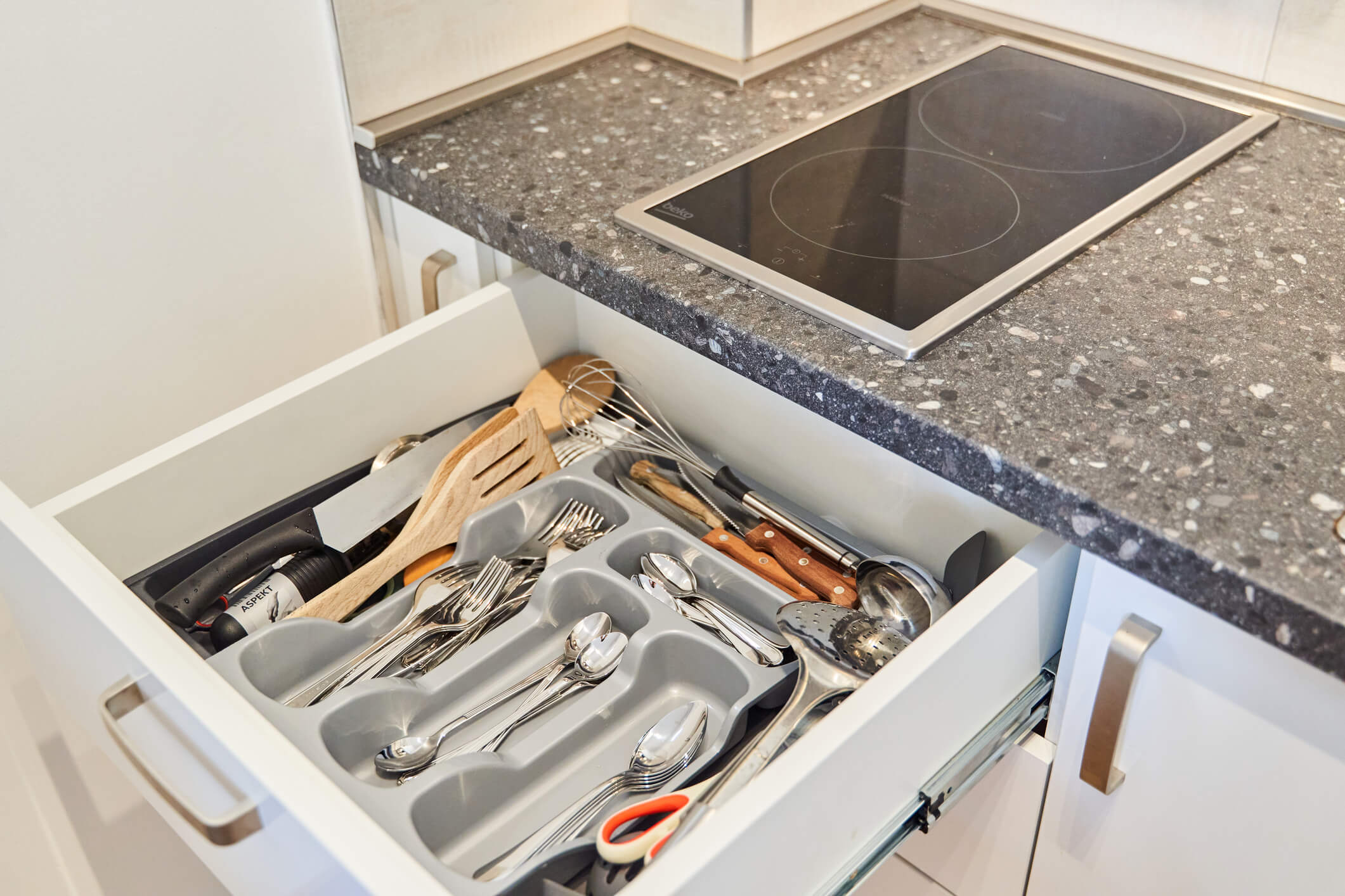 カトラリーなどの細かいものは収納ボックスでカテゴリー別に分けて収納すると取り出しやすく、きれいな状態を保ちやすいです。