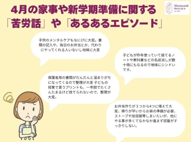 【新年度の家事負担に関する意識調査】ミニメイド・サービス株式会社 調べ 「新年度の苦労話やあるあるエピソード」